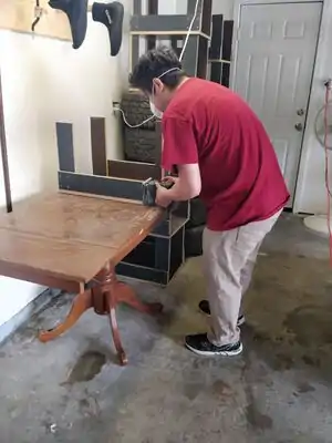 - Sand To get rid of the harsh, sharp edges, we used a palm sander with 80 and 100 grit sandpaper.