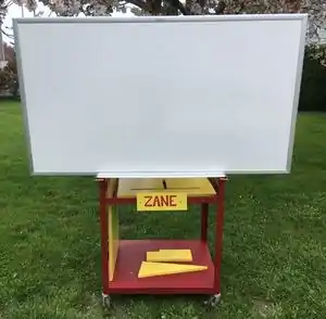 The final design consisted of a fold-flat podium made of MDP (medium density particleboard) and a second-hand Quartet whiteboard attached to an AV cart donated from Zane Middle School. When the podium is broken down to its constituent pieces it easily fits on the cart making the whole system portable as a single unit.