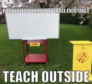 How can you bring a classroom nearly anywhere? Parties at Catherine L. Zane Middle School and Humboldt State University were pondering that very question. Team Yerba Mates and one other team were tasked with answering that question. After some deliberation Yerba Mates decided to focus on the instructor's portion of the classroom. The team went through several brainstorming sessions and determined that the most basic functional aspects of a classroom required by an instructor would be a level surface on which to store lecture materials and a writing surface to convey information to students. Due to frequent rain and winds in Humboldt County the client, Zane Middle School, requested the system be portable and storable. Yerba Mates finally decided on a fold-flat, collapsible podium and a whiteboard with shelving.