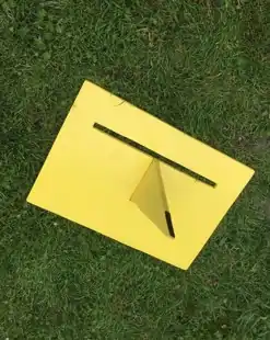 Next, cut out the body support by cutting out a triangle with a 9” base, a 6” height and a hypotenuse fitting of the Pythagorean Theorem. Then, cut out a rectangle measuring 9” long by 4” tall. This is the most difficult piece to fashion as one end of it must be flat for a few inches and then very gradually taper to an unmeasured angle. This angled portion is what the writing surface will rest on. This rectangular piece must also have a 4” long by 1” tall piece cut out of it to prevent it from slipping out of the hole cut into the body.