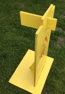 Gather two 3’ x 3’ sheets of MDP. First, cut a piece out using any saw that is 18” wide by 40” long. About a foot from the top, drill a pilot hole and use a jigsaw to cut out a rectangular hole measuring ¾” wide by 5” tall. This will be the body of the podium. Second, cut off two sections from one of the ends of the previous piece that measure 4” long by 2” tall, leaving a rectangle at that end. This is what the writing surface will slide onto. Next, cut a rectangle that measures 24” wide by 20” tall. This will be the base. Into this piece about 1” from the top, drill a pilot hole and then use a jigsaw to cut out a rectangular hole measuring ¾” tall and 18” long. This will be the hole into which the body will be inserted. Perpendicular to that hole, right down the center, cut another rectangular hole measuring ¾” wide by 6” long. This is where you will place the triangular body support.