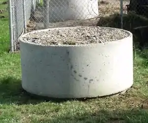 At the top of the tank is attached a four inch overflow outlet pipe which redirects the excess water away from the building and the pedestal that the tank sits on. This will prevent the water from pooling in the memorial area, which is the lowest area where the rainwater previously pooled. The pedestal is a 4-foot diameter manhole casing filled with concrete debris and gravel. This pedestal elevates the tank approximately two feet and gives some gravity feed to the garden area. The pedestal matches the manhole casings in the garden, which are utilized for garden beds, giving some visual tie to the garden as well as elevating the tank.