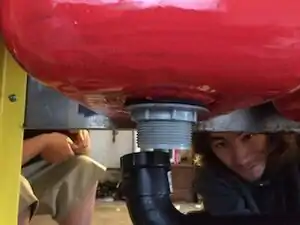 The final design includes a restaurant grade stainless steel sink(with three sinks) for durability and ease of maintenance. The sink is connected to a garden cart equipped with pneumatic wheels on an axle, providing the cart with an wide turn radius with the wagon style steering. The sink is attached to the cart with steel bars to elevate the sink and for reinforcement. The sink has a custom made lid with fitted seals for each sink to ensure the lid is stationary during transportation. The lid has two convenient handles right outside of the replicated school logo(painted by hand by Erin McDannold). Underneath the sinks, each drain is connected to a simple ABS drainage system that can be released directly over a sewer drain. The system can be activated with one main valve once each drain stopper is removed from each sink. The cart is help place over the sewer drain with a basic 2x4 foot under a pair of the wheels. On one side of the cart there is a tension clip in place to hold the wagon handle up while the cart is in use. To provide an area for a 5 gallon bucket filled with milk during transportation, small metal pegs have been installed on the handle side of the cart to ensure the client has control over the milk filled bucket.