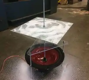 The Chladni Demonstration unit is based on the ideas of German Physicist Ernst Chladni, who developed the Chladni plate as a way to research sound and acoustics. He caused his plates to vibrate by bowing on them with a bow from a stringed instrument. A Chladni plate visually shows the nodes, or points of no displacement, of sound. Materials such as ceramic, glass, wood and a wide range of metals can be used for a Chladni plate. The Chladni plate can come in many shapes, although it is most commonly built as a square. The location of the nodes depends on the natural frequencies of the plate which depends on the shape, density and material used. Sand or other fine particles are placed on the top of the plate and when certain vibrations are induced on the plate, a standing wave pattern forms with the particles settling in the location of the nodes. A standing wave pattern is the pattern of the location of the nodes and anti-nodes.