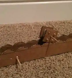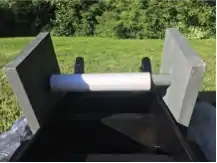 The wheeled component in this project consists of two square wheels and an axle. The wheels are 8- inches on each side (as requested by the client), and the thickness is ¾ inches. In the center of these square wheels is a wooden axel with a plastic PVC pipe incasing the axel. This allows the axel to spin freely as the user rolls the wheels along the catenary shaped track. The wheels and axel mechanism are bound together using 3-inch wood screws.