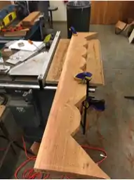 Step 2: Trace out track: Use geometry section to calculate the height, length, and thickness of catenaries. Once you know the size of wheel, you can determine the size of catenaries and start building the track. Print and cut out catenary shape on computer. Once the Catenaries (or Arc) is cut out you can start tracing it on to the 2”x12”x4.5’. Measure a straight line 5” from the bottom of the wood (this 5” line the where all the angles and arcs sit on top). Next draw a 45-degree line from on the top corners through the 5” line. Once your line is straight you can start tracing around the piece of paper with your arcs on it. Start the Arcs at the point where your 45-degree line intersects with the 5” line you made to insure everything straight. After you made your desired number of arcs draw another 45-degree line, opposite from the first one that was made. Repeat this whole process on a second piece of wood.