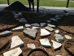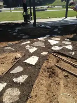 Step 5: Put in place large urbanite pieces for centerpiece and walkways. Make sure the urbanite pieces are level for ease of walking and to prevent users from tripping. |