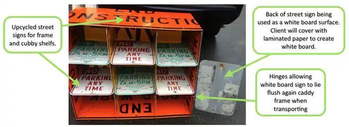 Almost the entire design Street Sign Storage Caddy had to be re-designed once it became clear that using wood would be too heavy, and it wouldn't hit the upcycling criteria. There were many other options for building a storage caddy, but focusing on the aesthetic criteria and the upcycled criteria, street signs became a clear option. After purchasing 36 pounds of street signs, Team Falcon-Jacks redesigned, and renamed the caddy design to the Street Sigh Storage Caddy. The caddy was now to be built entirely out of street signs. Large ones were used to make the backing, the sides, the top, and the bottom. Smaller parking signs were used to make each of the interior pockets, and the hinged whiteboard area. After showing the Street Sign Storage caddy to the client, Team Falcon-Jacks decided plotted angles instead of L brackets to hold together the larger parts of the Street Sign Storage caddy, so that it would last many years of hard use.