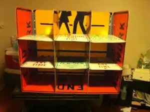 The Street Sign Storage caddy stores the Desktop Caddies when they are not in use by the students. The Street Sign Storage caddy has a total of nine cubby spots. On the side of the Street Sign Storage Caddy is a smaller parking sign that is hinged to the frame which is covered with laminated paper to allow it to be used as a white board. This allows the teacher to write what supplies should remain in the desktop caddies once returned at the end of the day. The hinge gives the white board the ability to be flattened against the frame of the Street Sign Storage caddy to make for easier transportation. The Street Sign Storage caddy has two handles on the side to allow for easy transportation by two people.