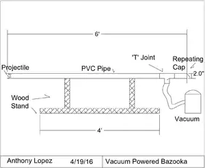 The final project is a fully operational vacuum bazooka. The vacuum bazooka is capable of shooting cylindrical projectiles that fill the volume of the PVC pipe. The cylindrical projectiles must fill the volume of the PVC pipe as this increases the suction force created from the vacuum, which in turn launches the projectile further. In order to make our vacuum we utilize a Shop-Vac 5986000 5-Gallon that has a peak of 4.5 HP. The shop vacuum is attached to a tee connector that is attached to the barrel. The length of our PVC pipe which composes our barrel is 5 ft. The Shop-Vac will be attached to a hose adapter which in turn will be connected to the tee connector. Once the Shop-Vac is turned on, a vacuum will be created by the Shop-Vac (from the pump within the Shop-Vac) which will create a suction force emanating from the tee connector. Once a cylindrical projectile is put in from the back of the vacuum bazooka, the suction force will propel the projectile towards the front of the vacuum bazooka and it will launch out.