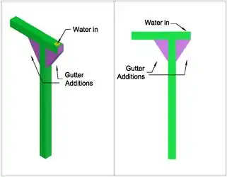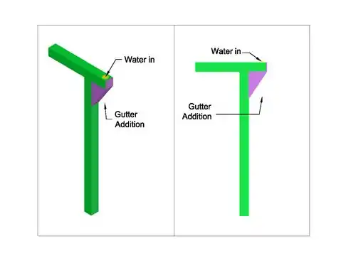 Two attachments were designed for each side of the downspout in order to create a more gradual path for the water and debris to travel through. The AutoCAD drawing in Figure 3 shows a schematic of the proposed design. The bottom portion of the horizontal component of the gutter was cut eight inches on each side of the downspout, which is up to the cut-off end on the front side, and the connected vertical components were cut off 11 inches down on the front side. The attachments consist of two eight by 11 inch 90 degree triangles and a rectangle to connect them by their hypotenuses. One inch flaps are attached to each side of the rectangle so that it is able to be attached to the current system as well as the triangles, and one inch flaps are also connected to the other two sides of the triangles which are used to connect to the current system. A small rectangle bracket is also used to cover the previously cut-off end of the gutter which is connected by using one inch flaps on each side as well. Finally, sealant is applied at every connecting area in order to prevent any leaks. Only the front part of the design was approved by maintenance, which can be seen in Figure 4 and is discussed more thoroughly in the Discussion and Next Steps section.