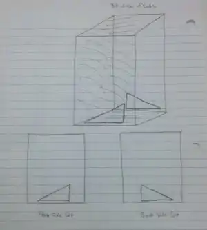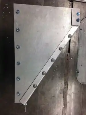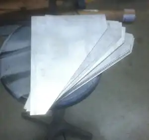 Caption - Cut triangular pieces out of metal that will be used as the side of the gutter additions.