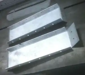 Caption - Cut rectangular pieces that will be used along the hypotenuse of the triangular pieces. Bend at a 90 degree angle along the length of the pieces. At the top of the front piece, bend to the correct angle to match the angle of the triangular pieces. At the bottom, bend the metal piece to be flush with the current gutter. See photo.