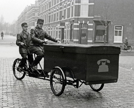Mechanics from the Dutch telecom department PTT (1940). Found at Transportfiets. The blog has more pictures of old Dutch carrier bikes, some of them below.