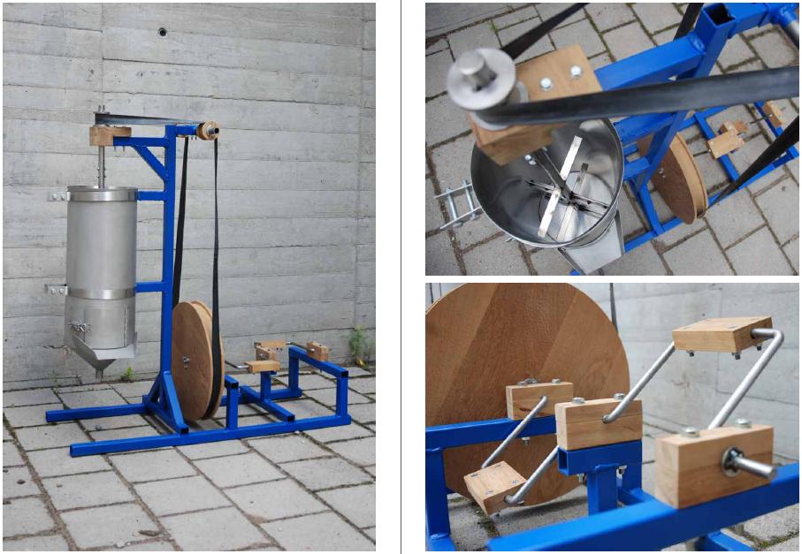 “Once this is done, the filter is placed in the bottom of cylinder. After the beaters are attached and the screws and nuts are tightened, the farmer should then control that the strap is stretched enough. If not, then it is just a matter of moving the axis to the next step and then tighten the nut. Before starting to pedal, place a clean hollowware of choice underneath the cylinder. Once the user has started pedalling and obtained an even rotation, the farmer can put the fruit into the cylinder. The juice will be filtered before it streams out into the hollowware.”
