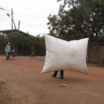 “To give the parabolic cooker its necessary reflective surface, we gathered around 300 tin can lids to line the inside of the basket. We punched holes in the can lids so we could string them together in lines of 8-10 lids each. Then we tied these lengths of can lids to the basket using either hemp twine or twist ties. Since there were still many spaces on the basket uncovered by can lids, we gathered a bunch of large can lids and attached those individually to the basket.”