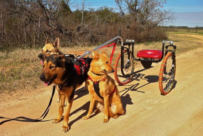 The sulky’s seat is behind the axle. When you sit on the seat, your weight lifts the shaft up. The shaft has upward lift on the harness. Think see-saw. Think lever and fulcrum. When the dog is pulling, your weight actually makes him lighter on his feet. Adjust the seat location relative to the axles/fulcrum by loosening the handle of the seat slider. A light weight rider sits further aft than a heavy rider. Mountain bike suspension forks allow the suspension sulky to ride smoothly on rough ground. Each wheel flexes over rough places independently from the other.