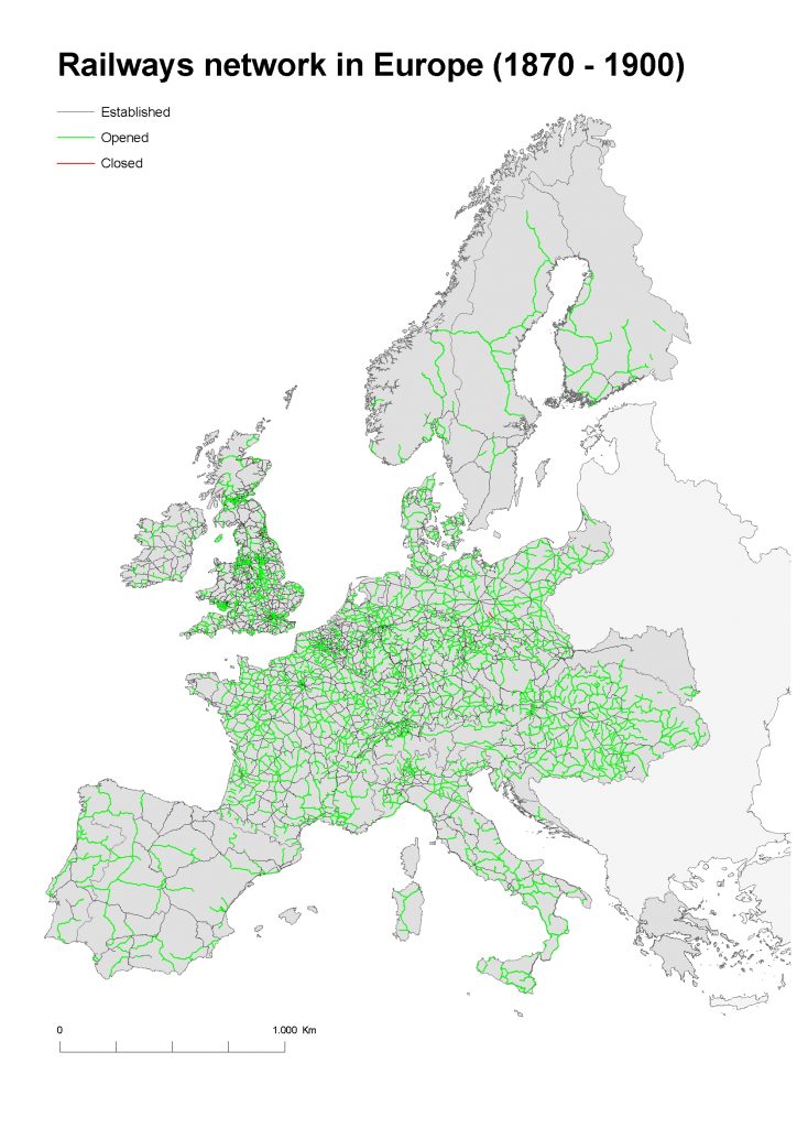 These five maps, based on GIS data and made by the Department of Geography and Sociology of the University of Lleida (Spain), show the evolution of the European railways infrastructure in the 19th and 20th centuries.