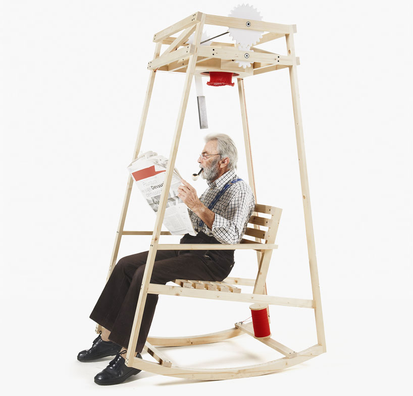 “Shown in the ruckstuhl building as part of ECAL’s ‘low-tech factory’ exposition during designers’ saturday in Langenthal, Switzerland is ‘Rocking Knit’ – a design that makes the transition to the winter season a little less onerous. Students of university of art and design Lausanne Damien Ludi and Colin Peillex created a chair that will fashion its user a beanie as they leisurely rock back and forth, activating gears that put the machine to work as its sitter relaxes.”