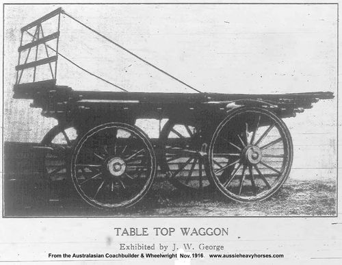 The Table Top Wool Wagon evolved from a somewhat smaller vehicle that appeared in the 1870s and carried a load of between 5 and 6 tonnes of both wool and wheat. The larger versions, especially designed for wool, appeared in the 1890s when road conditions improved. They reached their zenith in the 1910s. Below is a picture of a medium sized wagon (5 m long, 2 m wide) with a removable hay frame.