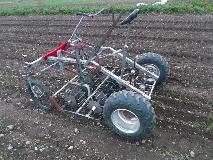 And if your farm is bigger with tighter time constraints, have 2 or 3 of these machines set up specifically for those 2 or 3 row spacings that you use the most, and put the interns or volunteers on them. For instance one with a basket weeder, one with sweeps, one with finger weeders. Or fatten the front tires and throw a 12 foot aluminum ladder across the chassis and hang those big plastic harvest bins from each end, out over the beds, for lettuce harvesting: you could put 100 pounds on each end of the ladder.”
