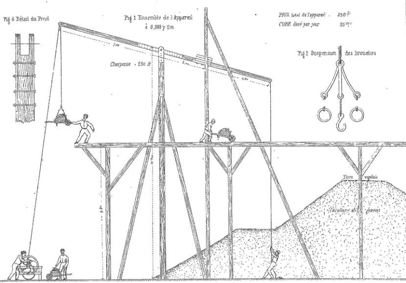 “An French illustration from 1870 shows us the unusual ways in which hand-driving lifting devices were used in the period. Push carts almost two metres long were lifted to 9.2 metres by hand cranks via an 11.5 metre long luffing lever, also operated by a worker, and then pushed further along a wooden path to a tipping point. This daring construction was almost 18 metres tall.”