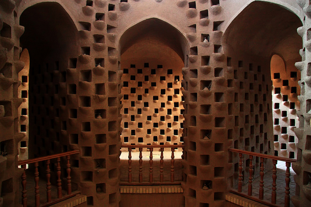 One unique aspect of the Persian pigeon towers is the ledge of the bricks on the inside of the structure. The repetitive feature creates a mesmerizing honeycomb effect, in which the whole becomes greater than the parts. It is also amazingly inventive, in that it enables the maximum number of coves with a minimum of building material. The bands of smooth plaster around the exterior of the tower may seem decorative, but are also highly functional: unlike the rest of the bricks, snakes have trouble climbing up this low-friction surface.