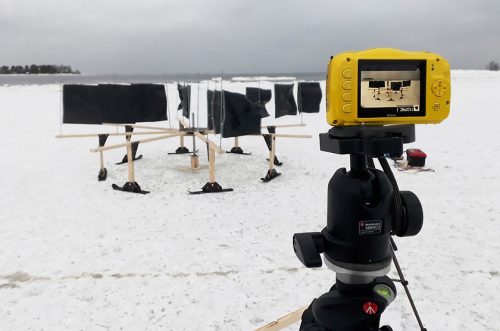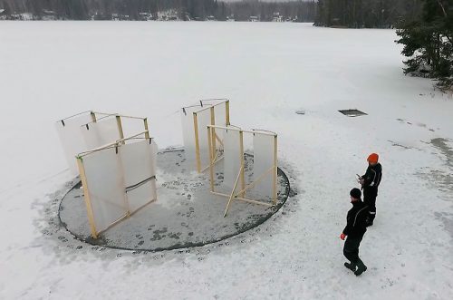 The vertical windmill on ice uses a number of skis to benefit from the low friction of the ice. The windmill spins around an axis that is fixed into the ice. The small prototype works very good, but if scaled up in size it would be necessary to take lifting forces into account. [Video]