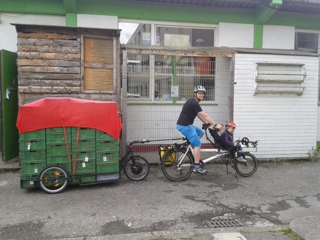 The German-made Carla Cargo is a three-wheeled cycle trailer with an electric assist motor. It can be pulled by any type of bicycle (including a cargo cycle or an electric bike), and it allows you to carry heavy (up to 150 kg) and bulky cargo (a loading platform of 60 x 160 cm). Uncoupled from the bicycle, the Carla Cargo works as a hand cart for large or heavy loads. The vehicle weighs 40 kg including the battery, and has a range of 40 to 60 km.