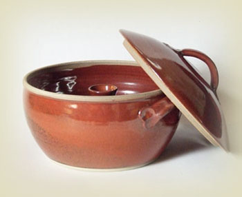When I visited my cousin last week in the French Dordogne, I stumbled upon a ceramic steamer in her kitchen. It was hand made by Laurent Merchant, an artisan living and working in the region. Ceramic food steamers are everything but new — they were already used in Neolithic China 6 to 7000 years ago* — but this one was different. Just like any other steam cooker, it is placed above a pot with boiling water. However, the steam enters through a central chimney rather than through dozens of little holes. The obvious advantage is that you don’t lose the juice, which greatly increases the potential uses of steaming.