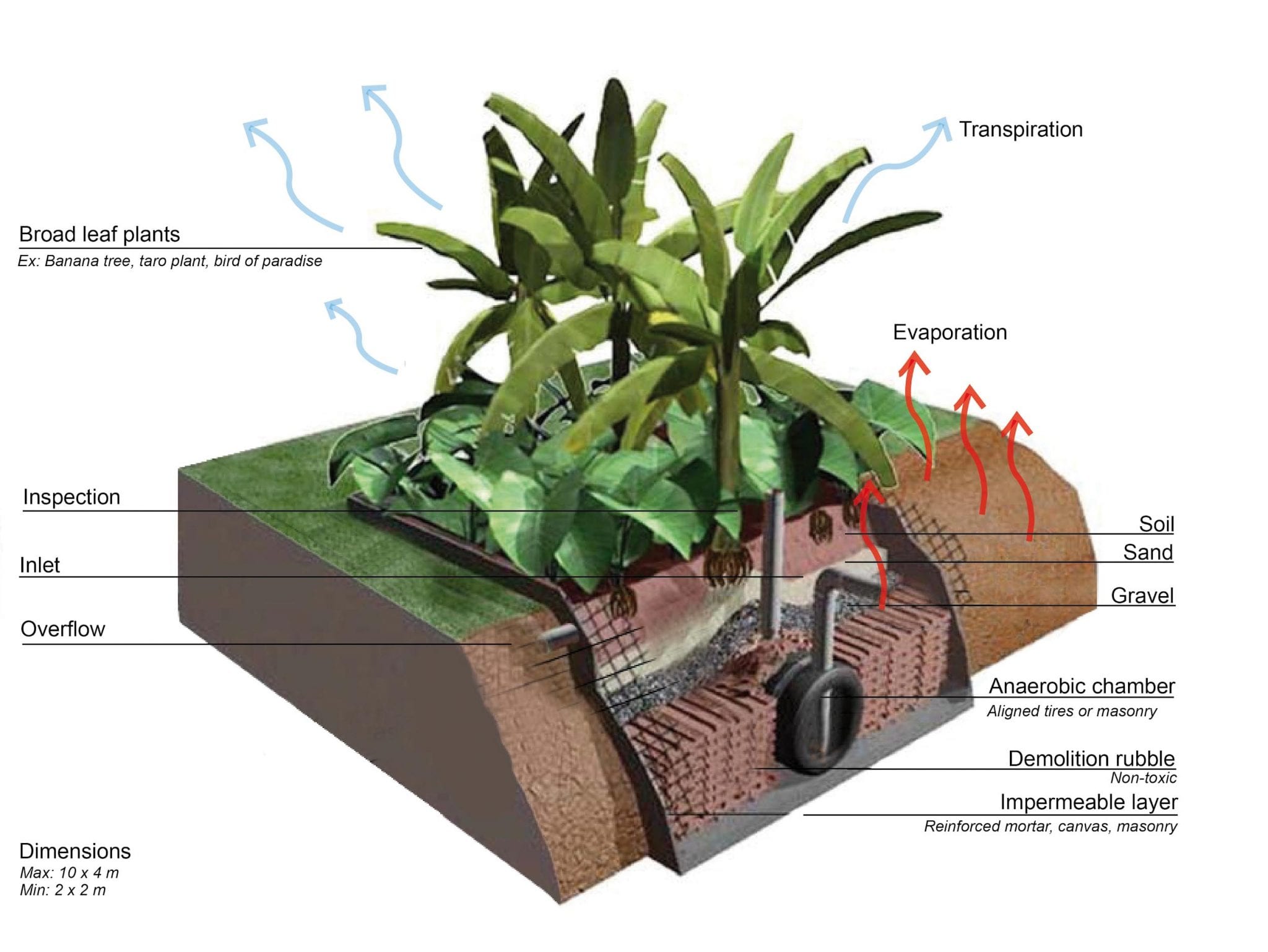 EcoSanitation is a closed-loop concept of sewage treatment that employs the planet’s natural hydrological cycle to close the gap between sanitation and agriculture. The hydrological cycle, a term we use to illustrate the paths of water between atmosphere, earth and oceans, includes the essential process of evapotranspiration. Evapotranspiration is the sum of water transfer to the atmosphere due to evaporation (from soil) and transpiration (from the metabolic processes of plants). This naturally occurring phenomenon, which separates water vapor from organic material, can be harnessed to safely process the nutrients of human waste while supporting the growth of edible fruits and vegetables.