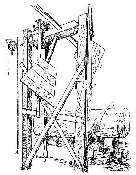“It is a windmill constructed in combination with two trees. The trees only serve as a support for the upper part and for the ladder to reach the top. The mill was built in Illinois (US) and worked so well that several have been constructed.”