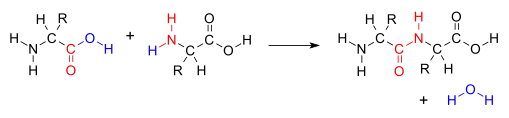 Amino acids have 2 different functional groups in a molecule - a basic amino group () and a carboxyl group (). The two groups can react in a condensation reaction to form a dipeptide: