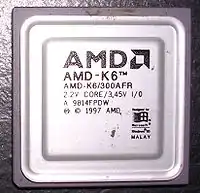 The above is a picture of the processor called AMD-K6-III. This CPU would be put into Super Socket 7. The processor compares to a Pentium II with a MHz between 350 and 450. This current processor is a 450 MHz model.