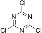 Its three chlorine atoms can readily form HCl with a hydrogen from -OH or -NH2, leaving the O or N attached to the triazine ring in place of the Cl.