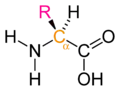 The general structure of an α-amino acid. The α-carbon is displayed in orange, and the side chain is denoted by R. This style of diagram does not indicate whether the amino acid is an L or a D enantiomer.