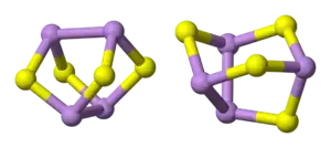 Realgar is an orange-red mineral used as a pigment in ancient times. Pararealgar is orange-yellow. They have different colours because they have different crystal structures, despite having the same empirical formula, AsS. The crystal structures of realgar and pararealgar contain differently-connected As4S4 molecules − these are shown above, realgar to the left, pararealgar to the right.