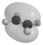 Alkenes such as ethene (shown to the right) have a carbon-carbon double bond. In such a double bond, there is significant electron density above and below the plane of the bond. Rotation around the bond is greatly restricted by a large energy barrier. For rotation to occur, groups attached to one of the double-bonded carbons would have to temporarily occupy this high electron density region, resulting in very high repulsion between the electrons in the group and the electrons in the double bond.