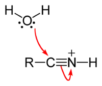 Nitrile hydrolysis proceeds by the mechanism outlined below. It begins with protonation of the nitrile nitrogen, which increases the partial positive charge on carbon and therefore renders carbon more susceptible to nucleophilic attack by a water molecule. Addition of water to the nitrile is the key step in nitrile hydrolysis − the next few steps are simple proton transfers, until an amide is formed. The amide then typically undegoes further hydrolysis to a carboxylic acid.