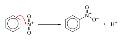 Arenes react with NO2+, a highly electrophilic linear cation called the nitronium ion. As a result, a nitro group, RNO2, replaces a hydrogen atom on the arene's benzene ring.