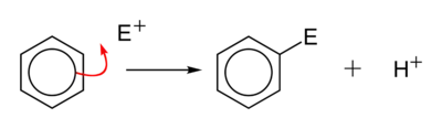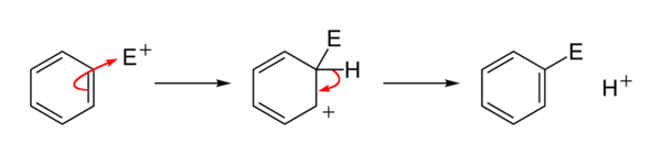 Once a suitably electrophilic species, E+, has been generated, it will react rapidly with benzene. A highly unstable intermediate (containing a tetrahedral carbon) is formed, which significantly disrupts the delocalisation of electrons in the ring. The intermediate immediately releases a proton in order to regain a fully aromatic ring and hence decrease its energy considerably.