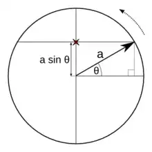 Phasors are a method of describing waves which show two things: the displacement caused to the medium, and the point in the repeating waveform which is being represented. They consist of a circle. An arrow moves round the circle anticlockwise as the wave pattern passes. For every wavelength that goes past, the arrow moves 360°, or 2πc, starting from the right, as in trigonometry. The angle of the arrow from the right is known as the phase angle, and is usually denoted θ, and the radius of the circle is usually denoted a. The height of the point at the end of the arrow represents the displacement caused by the wave to the medium, and so the amplitude of the wave at that point in time. The time taken to rotate 360° is known as the periodic time, and is usually denoted T.