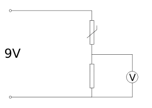 A potential divider may work by combining a variable resistor such as an LDR or thermistor with a constant resistor, as in the diagram below. As the resistance of the variable resistor changes, the ratio between the resistances changes, so the potential difference across any given resistor changes.