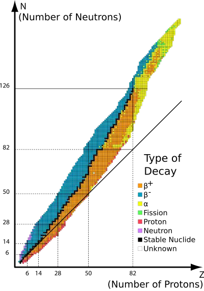 Unstable nuclei with a mass below 82u emit β radiation. There are two types of β radiation. β- radiation consists of an electron (). This is produced by nuclei with many more neutrons than protons. A neutron changes into a proton, emitting an electron and an antineutrino in order to balance the lepton number. β+ radiation consists of an positron (). This is produced by nuclei with roughly the same number of neutrons as protons. A proton changes into a neutron, emitting a positron and a neutrino.