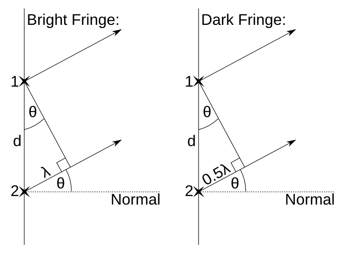If we wish to calculate the position of a bright fringe, we know that, at this point, the waves must be in phase. Alternatively, at a dark fringe, the waves must be in antiphase. If we let the wavelength equal λ, the angle of the beams from the normal equal θ, and the distance between the slits equal d, we can form two triangles, one for bright fringes, and another for dark fringes (the crosses labelled 1 and 2 are the slits):