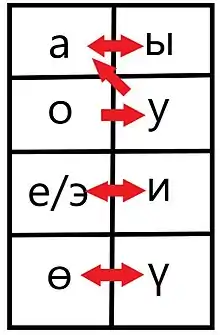 Kyrgyz vowels are linked together in pairs, of which one is a “left” vowel and one is a “right” vowel. If a suffix needs a left vowel, then it takes the left vowel that corresponds to the last vowel in the stem.