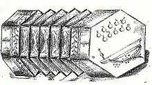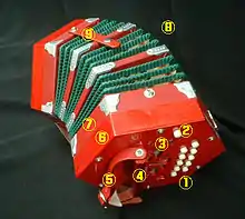 The concertina was developed before the accordion, to compete against reed organs which appeared about the same time, with similar reed technology. This was accomplished with ten buttons. This gives the instrument a complete octave for either hand. An extra extra button plays notes above or below the octave. There are several different patterns of systems of concertina and accordion. Many designs are found, but most contemporary manufacturers follow the C/G anglo-German pattern pictured.