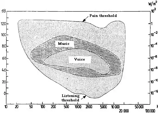 The study of sound perception is limited by the complexity of the human ear mechanisms. The figure below represents the domain of perception and the thresholds of pain and listening. The pain threshold is not frequency-dependent (around 120 dB in the audible bandwidth). At the opposite side, the listening threshold, as all the equal loudness curves, is frequency-dependent.