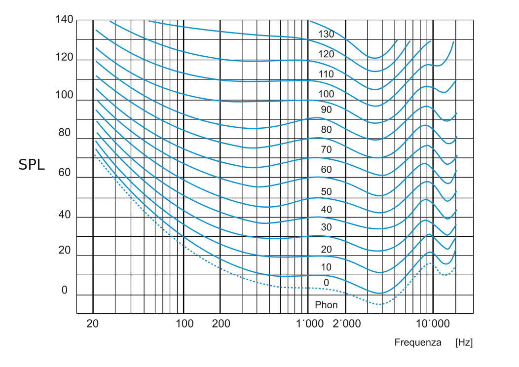 Two sounds of equal intensity do not have the same loudness, because of the frequency sensibility of the human ear. A 80 dB sound at 100 Hz is not as loud as a 80 dB sound at 3 kHz. A new unit, the phon, is used to describe the loudness of a harmonic sound. X phons means “as loud as X dB at 1000 Hz”. Another tool is used : the equal loudness curves, a.k.a. Fletcher curves.