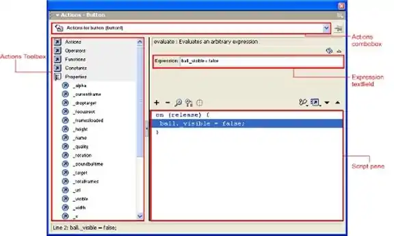 Actions toolbox is used for helping you to write script. The script is written in Script pane. There are 2 modes of programming in Flash MX. The first one is Normal Mode, which is for beginners and the code is written with the help of Actions Toolbox and Expression text field, and the second one is the Expert mode, which consists only of Actions Toolbox and Script Pane. If you use Normal Mode, then the Expression text field helps you to write the expression in it. And the Actions Combo Box is used to navigate from one object to another.